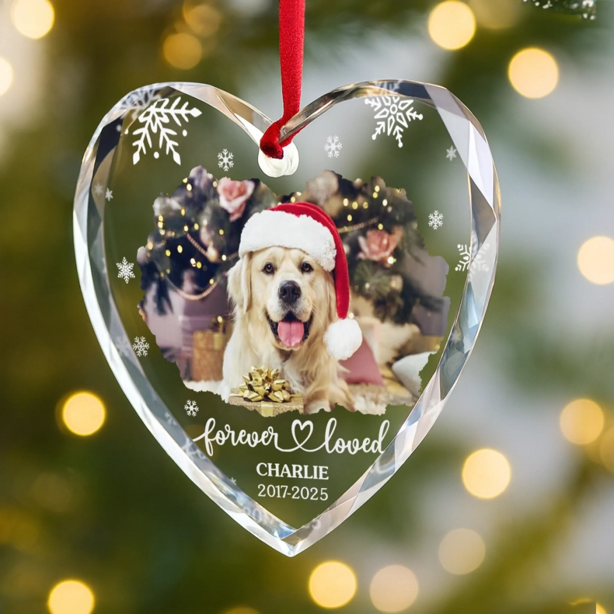 Custom Photo Heart Glass Ornament - Personalized Pet Christmas Memorial Sympathy Gifts For Dogs, Cats - Forever In My Heart Pawprints